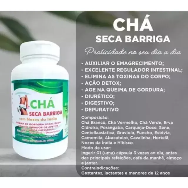 O Chá Seca Barriga com Nozes da Índia é um chá natural recomendado para perda de medida. A fórmula atua regulando o intestino, eliminando toxinas inúteis para o organismo e diminuindo o inchaço. Queima gordura localizada e reduz taxas de colesterol, diabete e pressão alta.
