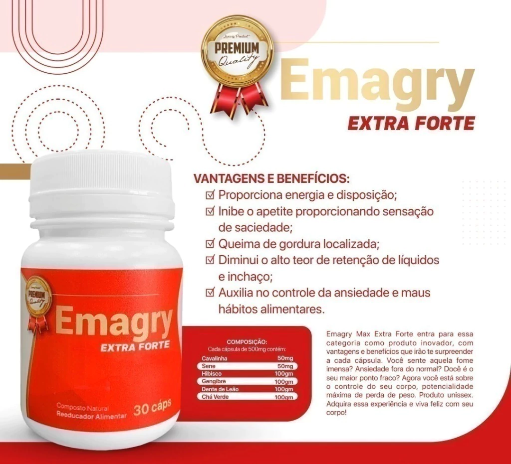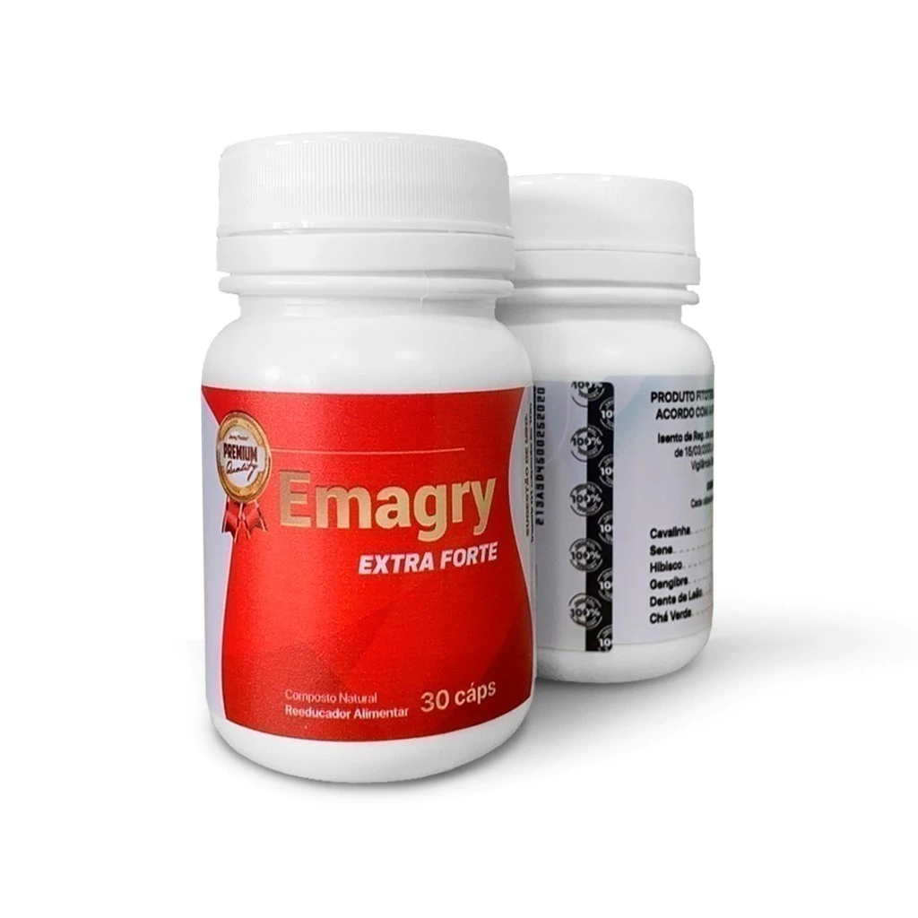O Emagry Extra Forte 30 cápsulas original é um emagrecedor natural à base de ervas, por ser um produto da linha premium o Emagry extra forte é um dos mais potentes com alta porcentagem de emagrecimento. O composto é indicado para pessoas que querem perder peso, pois ele acelera o metabolismo, reduzindo assim a gordura no organismo. Sua fórmula inibe o apetite e ajuda na reeducação alimentar.